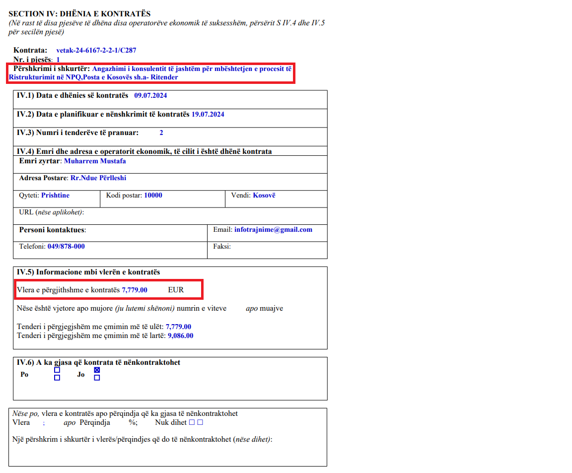 Në detajet e kontratës, theksohej se angazhimi i këtij konsulenti nga Posta e Kosovës është 60 ditë, apo dy muaj.