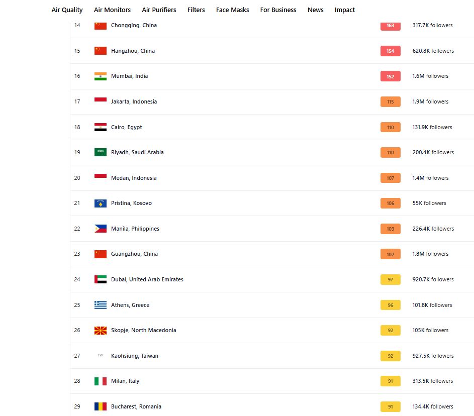 Kryeqyteti i Kosovës, Prishtina, këtë mbrëmje po renditet e 21-ta në botë sa i përket cilësisë së ndotjes së ajrit.Bazuar në matjet e “IQ Air”, vlera e nivelit të grimcave të dëmshme PM është 106.