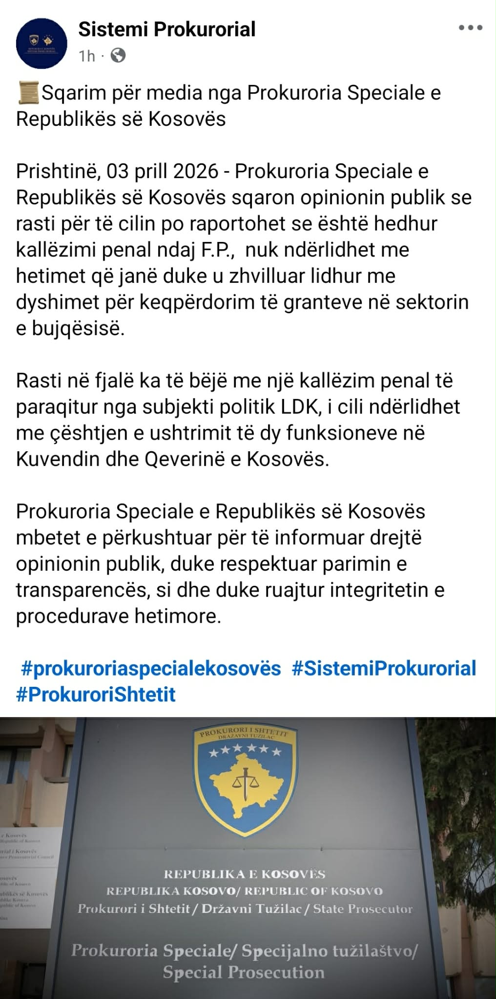“Prokuroria e Republikës së Kosovës sqaron opinionin publik se rasti për të cilin po raportohet se është hedhur kallëzimi penal ndaj F.P., nuk ndërlidhet me hetimet që janë duke u zhvilluar lidhur me dyshimet për keqpërdorim të granteve në sektorin e bujqësisë. Rasti në fjalë ka të bëjë me një kallëzim penal të paraqitur nga subjekti politik LDK, i cili ndërlidhet me çështjen e ushtrimit të dy funksioneve në Kuvendin dhe Qeverinë e Kosovës”, thuhet në njoftimin e Prokurorisë.