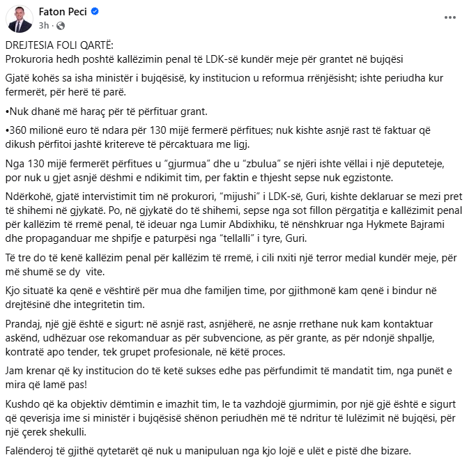Ky është postimi i plotë i Pecit, në të cilin, pos tjerash ai tha se “drejtësia foli qartë”, ndërsa ofendoi ish-deputetin e LDK-së, Paris Guri.