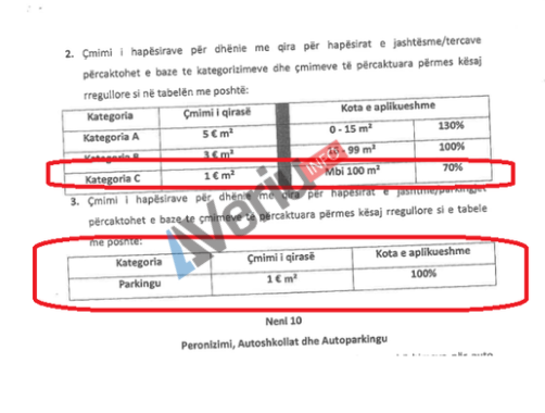 Sipas paragrafit 3 të neni 9 të kësaj rregulloreje çmimi i qirasë për parking është 1 euro m2. Po ashtu edhe paragrafi 2 i nenit 9 thotë se çmimi i hapësirave të jashtme për dhënie me qira të kategorizuara në Kategorinë C (mbi 100 m2) është 1 euro m2.