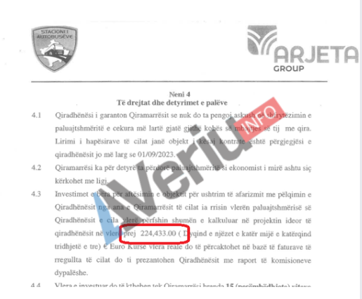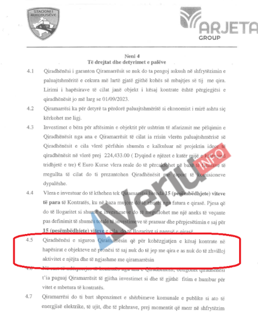 Me marrëveshjen e nënshkruar mes kompanisë publike lokale “Stacioni i Autobusëve” dhe “Arjeta Group”, qiraja mujore e lokalit është 5020 euro. Mirëpo, duke pas parasysh favorizimin në zbritje të investimit që krijohet në vlerë prej 224 mijë 433 euro, atëherë i bie se “Arjeta Group” nuk do të paguaj qira për rreth 44 muaj.