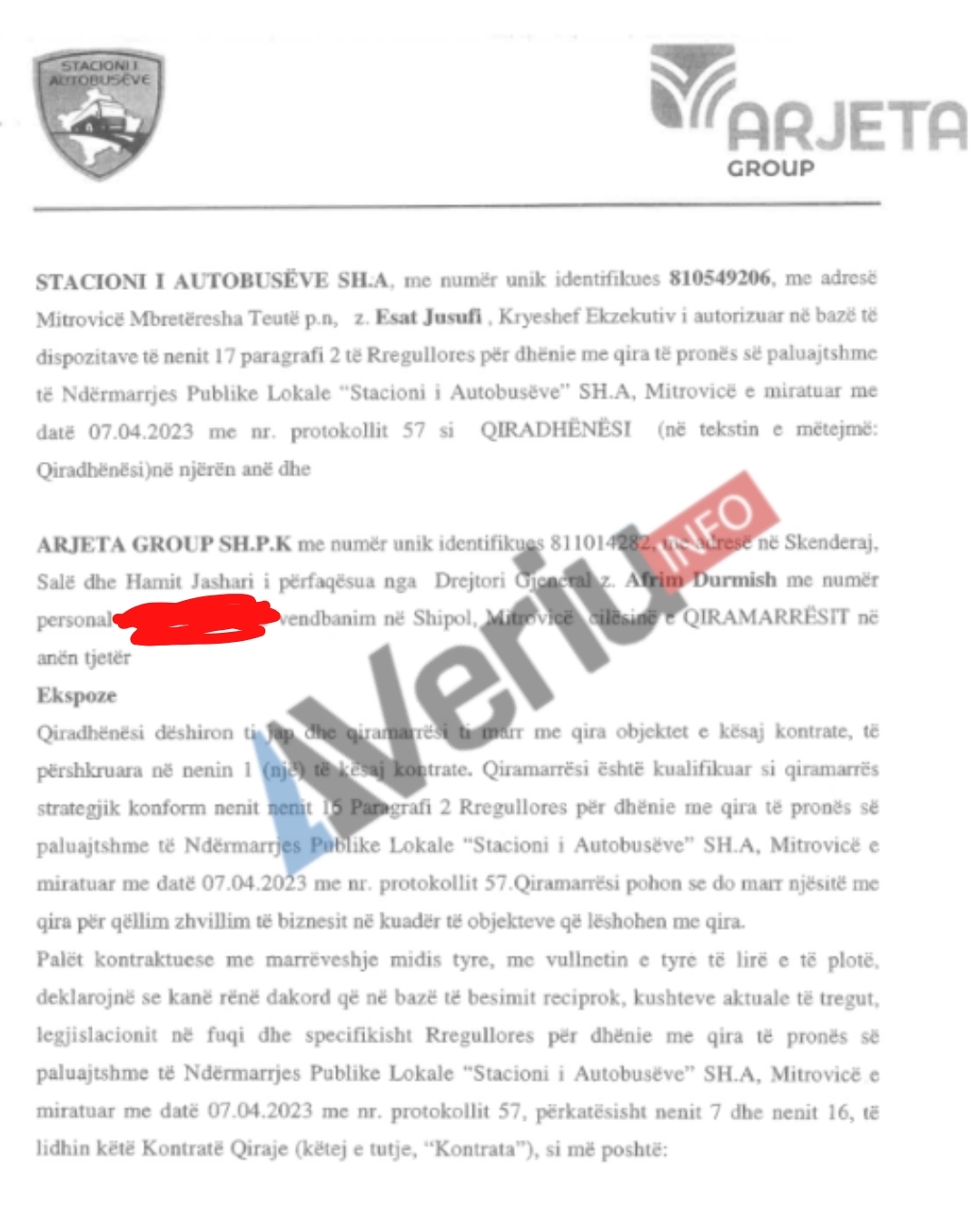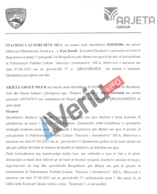 Në qershor të vitit 2023 Ndërmarrja Shërbyese e Transportit Tokësor “Stacioni i Autobusëve” Sh.A. – Mitrovicë ka nënshkruar kontratë për qiradhënie me kompaninë “Arjeta Group” Sh.P.K., e cila në Agjencinë e Regjistrimit të Bizneseve ka emër tregtar “Qendra Tregtare Arjeta QTA”. Pas një hulumtimi të gjatë, Veriu.info ka gjetur se kontrata është nënshkruar me shkelje flagrante ligjore dhe në dëm të pronës publike.
