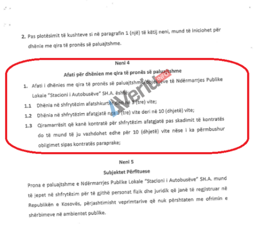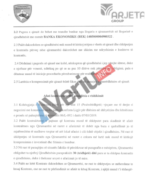 Kontrata e nënshkruar nga Esat Jusufi, Kryeshef Ekzekutiv i ndërmarrjes publike lokale “Stacioni i Autobusëve” – Mitrovicë, Esat Jusufi dhe Afrim Durmishi, pronar i “Arjeta Group” Sh.P.K. është e lidhur për 15 vite, gjë që është në kundërshtim të plotë me Rregulloren për Dhënie me Qira të Pronës së Paluajtshme të Ndërmarrjes Publike Lokale “Stacioni i Autobusëve” Sh.A. – Mitrovicë.