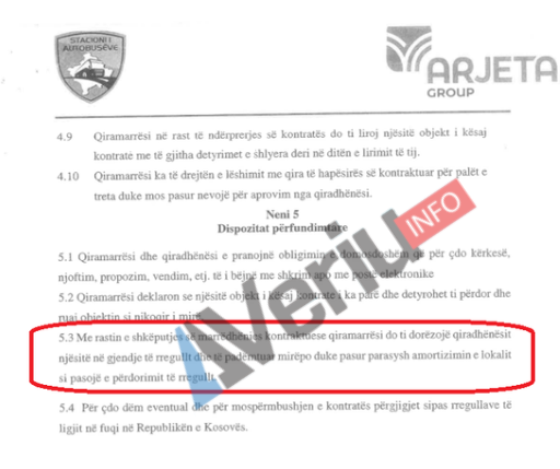 Sipas nenit 5.3 me rastin e shkëputjes së kontratës qiramarrësi (“Arjeta Group” Sh.P.K.) do t’i dorëzoj qiradhënësit njësitë në gjendje të rregullt, por duke pasur parasysh shkallën e amortizimit të lokalit si pasojë e përdorimit. Pra, përkundër që 224 mijë 433 euro të investimit nga “Arjeta Group” Sh.P.K. i zbatohen në qira dhe dëmtohet “Stacioni i Autobusëve” në inkasim, lokali do t’i dorëzohet pas 15 vitesh në gjendje të amortizuar. Cili investim në një lokal ka vlerë reale pas 15 vitesh? Kjo nënkupton se me rastin e dorëzimit të lokalit pas 15 vitesh, ndërmarrja publike nuk do të ketë thuajse asnjë euro vlerë të mbetur nga ky investim i zbritur në qira.