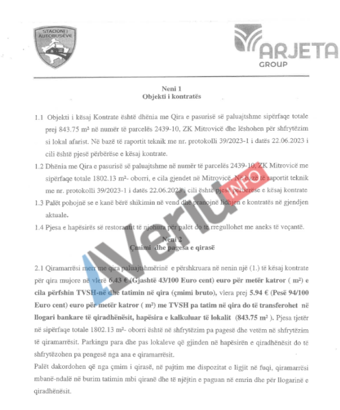 Sipas neni 2 të kontratës, qiramarrësi (“Arjeta Group” Sh.P.K.) merr me qira paluajtshmërinë në vlerë prej 6.43 euro për m2 (çmimi bruto), ndërsa vlerën prej 5.94 euro për m2 do t’a transferojë në xhirollogarinë bankare të ndërmarrjes publike komunale “Stacioni i Autobusëve” për hapësirën e lokalit prej 843.75 m2.