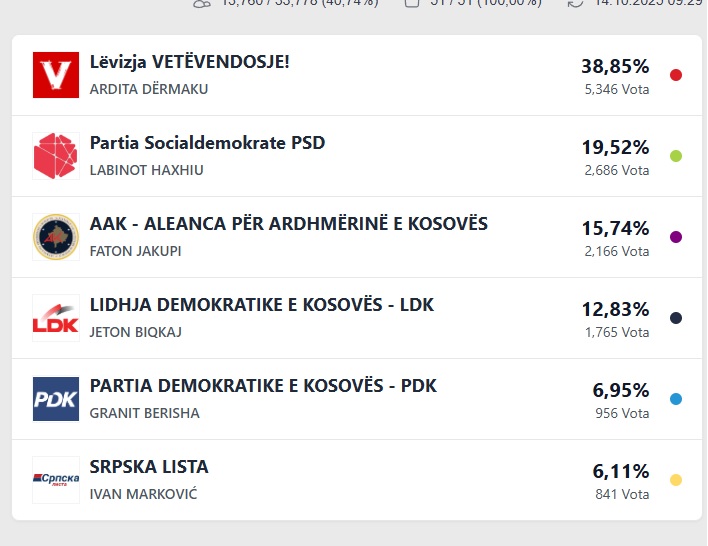 Ndërkohë, kandidati i PSD-së për kryetar, Qëndron Kastrati, ka marrë 27,98% të votave, apo 4,089 gjithsej. /Indeksonline/