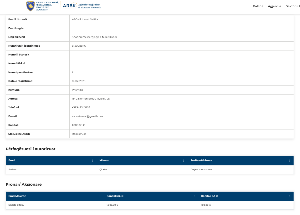 Ndërsa në Agjencinë për Regjistrimin e Bizneseve shkruan se pronare me 100% të aksioneve në “Asons Invest” Sh.P.K. është Sadete Çitaku, në vendimin e Inspektoratit të Punës thuhet se pronar i kësaj kompanie është Arben Çitaku, ndërsa Sadete Çitaku është vetëm përfaqësuese e autorizuar e kompanisë.