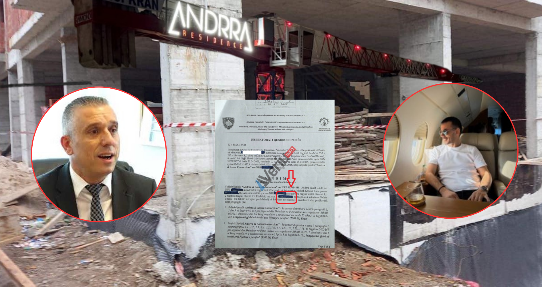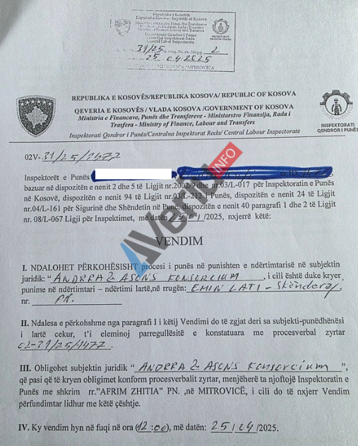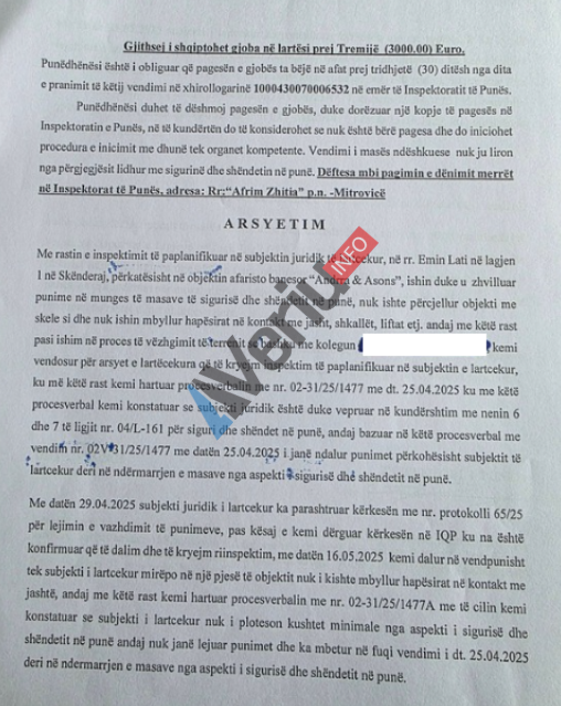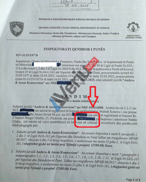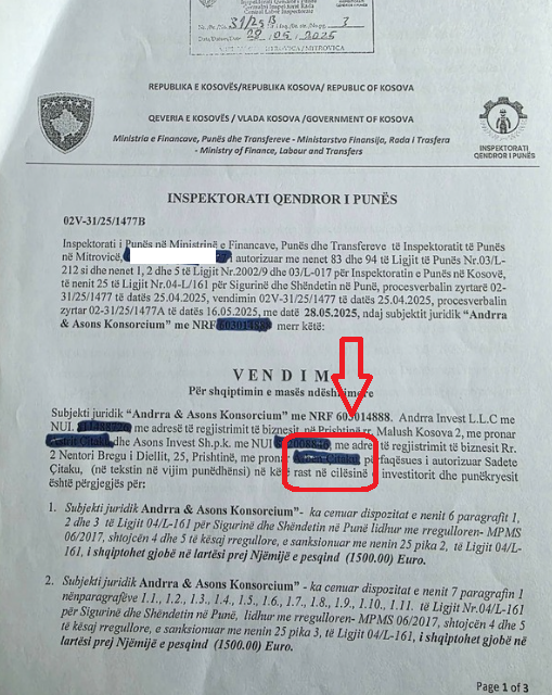 Veriu.info ka siguruar një vendim të Inspektoratit të Punës, me të cilin “Andrra Invest” L.L.C., e Astrit Çitakut, dhe “Asons Invest” Sh.P.K., e Arben Çitakut, janë gjobitur me 3 mijë euro për shkelje të dispozitave të Ligjit për Sigurinë dhe Shëndetin në Punë, gjatë ndërtimit të një objekti banesor që po e ndërtojnë në Skenderaj si konsorcium.