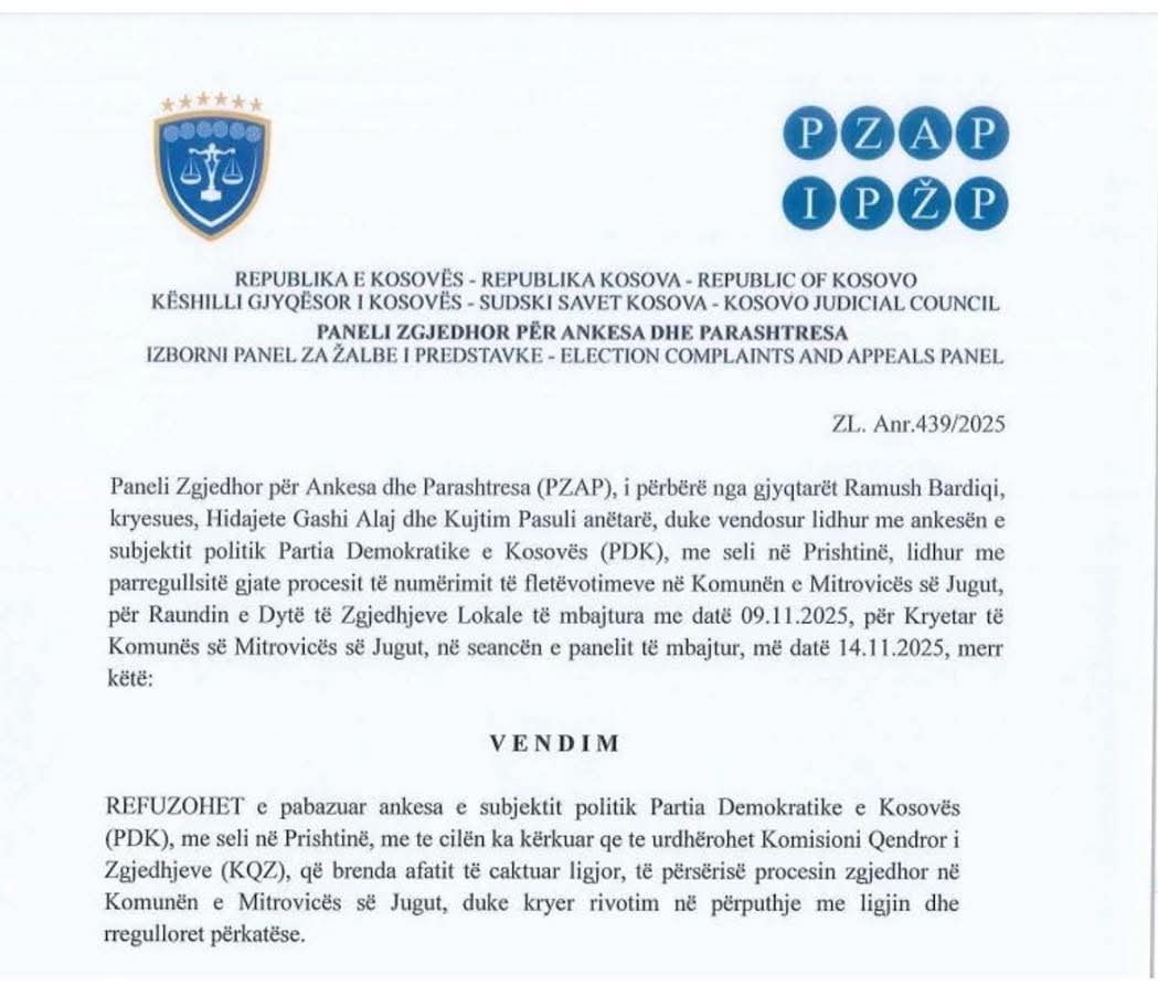 Paneli Zgjedhor për Ankesa dhe Parashtresa ka refuzuar ankesën e PDK-së për zgjedhjet lokale në Mitrovicën e Jugut, përmes të cilës kërkonte dërgimin e kësaj komune në rivotim.