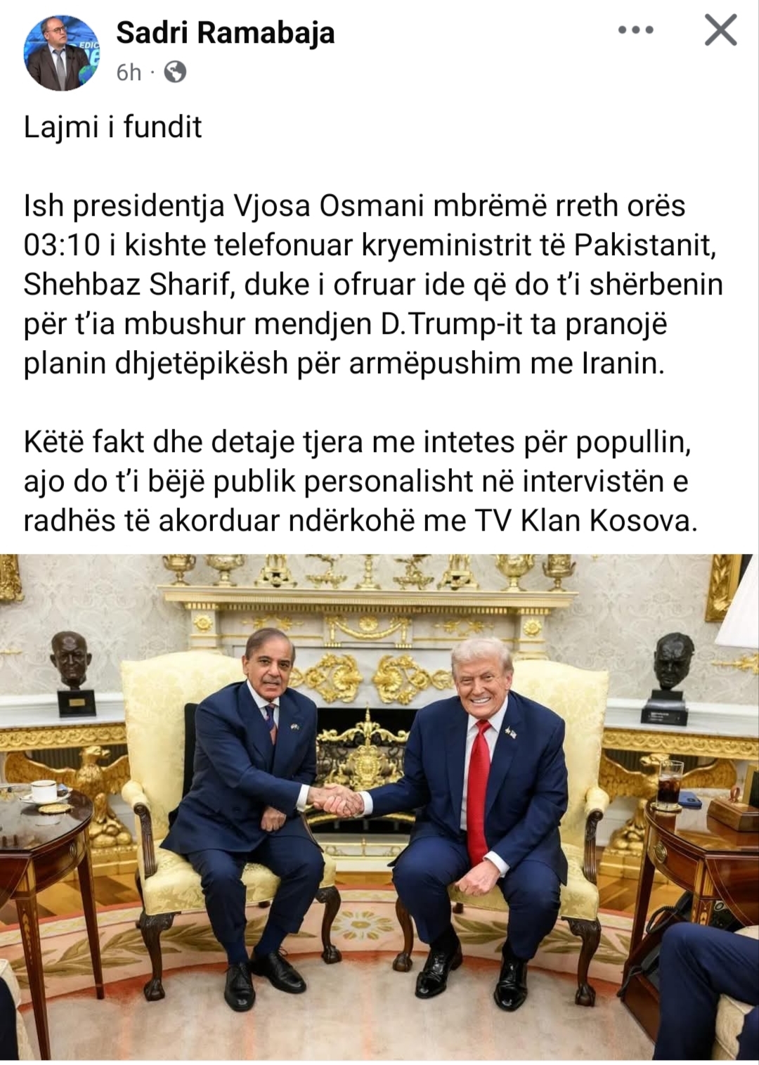 Në postimin e tij, Ramabaja shkruan me tone ironike se Osmani, rreth orës 03:10 të mëngjesit, i kishte telefonuar kryeministrit të Pakistanit, Shehbaz Sharif, për t’i ofruar ide që do ta ndihmonin në bindjen e Donald Trump për pranimin e një plani dhjetëpikësh për armëpushim me Iranin.