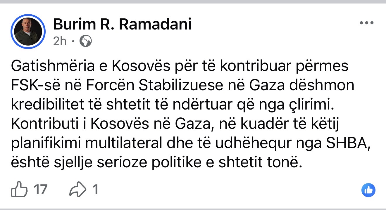 Opinionisti Burim Ramadani, thtoë se gatishmëria e FSK-së për të kontribuar në Gaza, është sjellje serioze politike e shtetit tonë.
