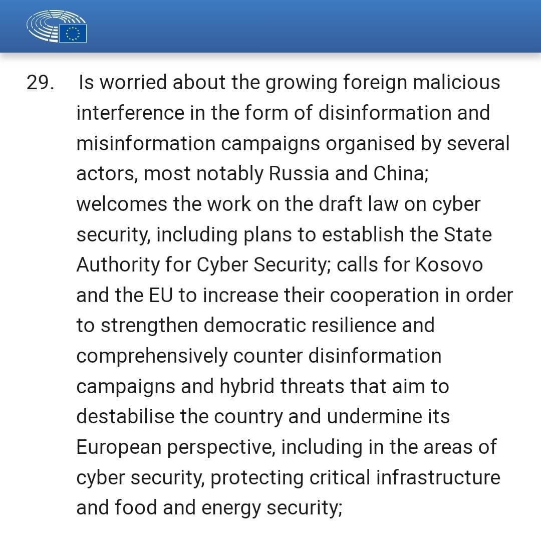 “I bëhet thirrje Kosovës dhe BE-së që të rrisin bashkëpunimin për forcuar demokracinë dhe të luftojnë në mënyrë gjithëpërfshirëse fushatat e dezinformimit dhe kërcënimet hibride që synojnë të destabilizojnë vendin, të cilat minojnë perspektivën e tij evropiane, duke përfshirë në fushat e sigurisë kibernetike, mbrojtjen e infrastrukturës kritike dhe sigurinë energjetike”, shton raporti.