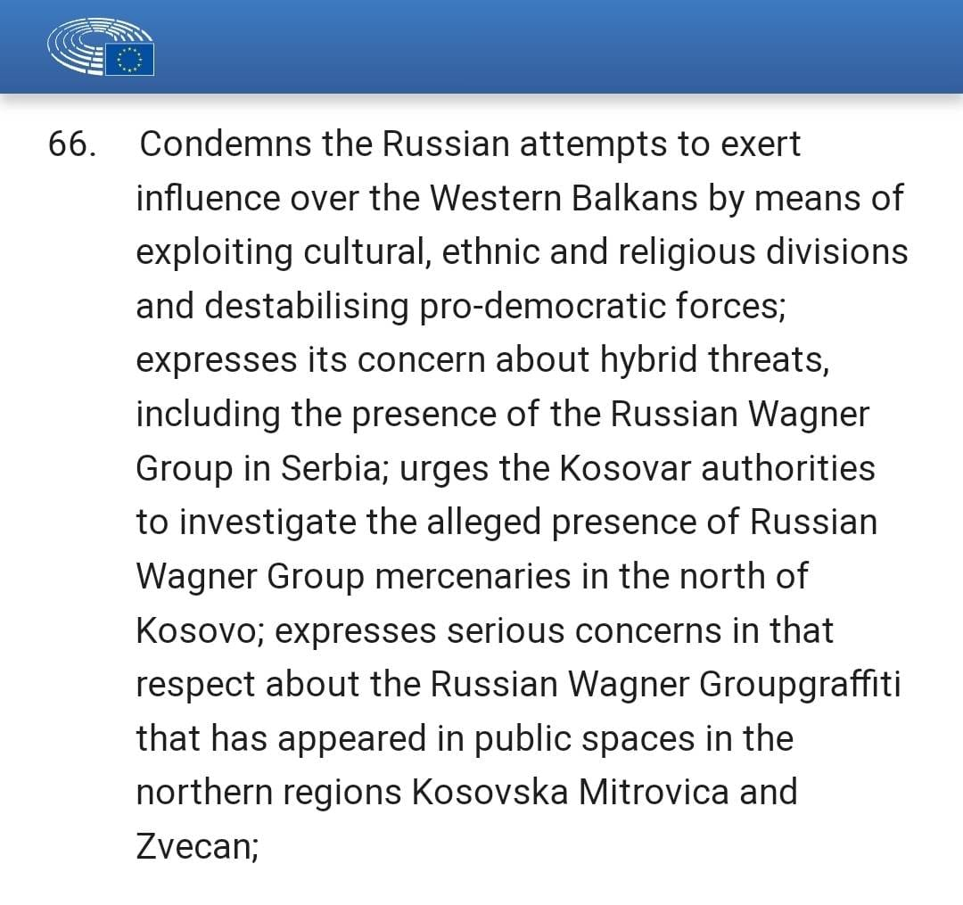“Dënohet përpjekja ruse për të ushtruar ndikim mbi vendet e Ballkanit Perëndimor me anë të shfrytëzimit të ndarjeve kulturore, etnike dhe fetare dhe destabilizimit të forcave pro-demokratike dhe shprehet shqetësimi për kërcënimet hibride, duke përfshirë praninë e grupit rus Wagner në Serbi”, thotë Parlamenti Evropian.