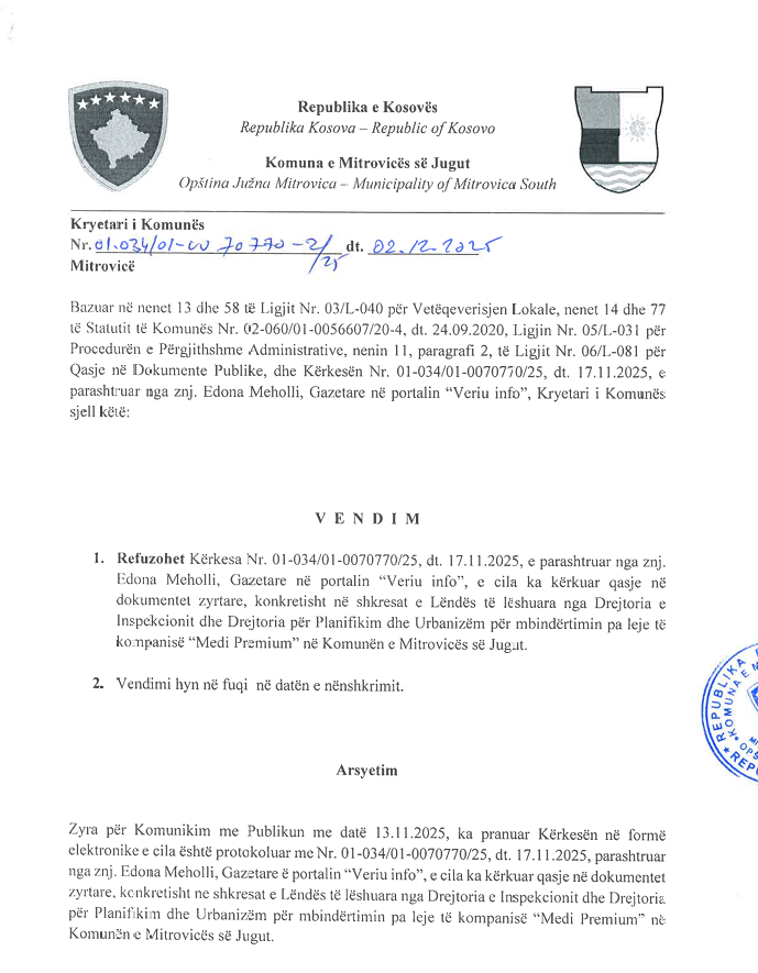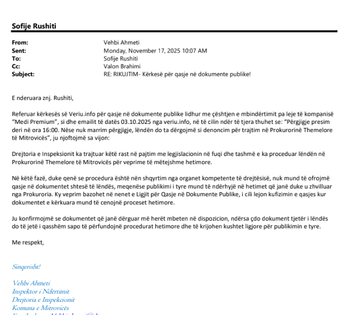 “Referuar kërkesës së Veriu.info për qasje në dokumente publike lidhur me çështjen e mbindërtimit pa leje të kompanisë “Medi Premium”, si dhe emailit të datës 03.10.2025 nga veriu.info, në të cilin ndër të tjera thuhet se: “Përgjigje presim deri në ora 16:00. Nëse nuk marrim përgjigje, lëndën do ta dërgojmë si denoncim për trajtim në Prokurorinë Themelore të Mitrovicës”, ju njoftojmë sa vijon: Drejtoria e Inspeksionit ka trajtuar këtë rast në pajtim me legjislacionin në fuqi dhe tashmë e ka proceduar lëndën në Prokurorinë Themelore të Mitrovicës për veprime të mëtejshme hetimore.