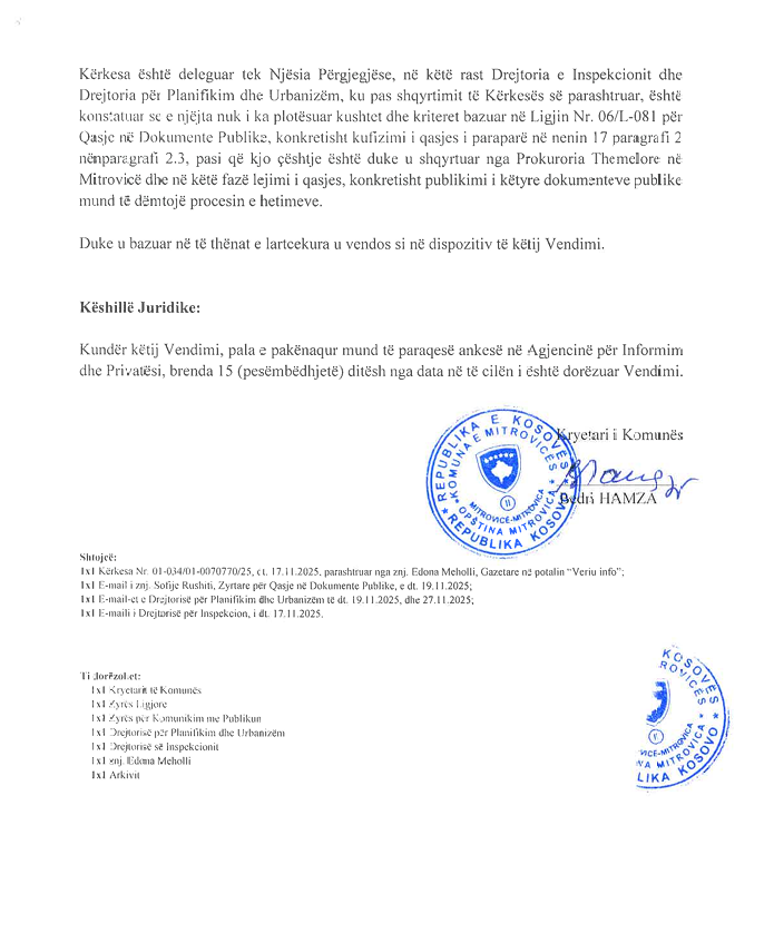 Sot, Veriu.info ka pranuar një vendim të nënshkruar nga kryetari në shkuarje, Bedri Hamza, me të cilin refuzohet kërkesa e parashtruar nga Veriu.info për shkresat e kësaj lënde.