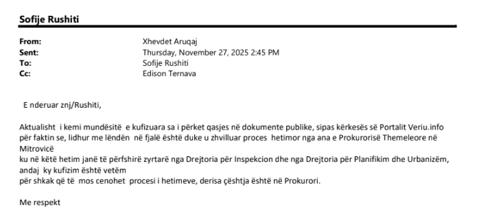 Në e-mailin e dërguar nga zyrtarja përgjegjëse për qasje në dokumente publike në Komunën e Mitrovicës, janë bashkëngjitur edhe disa komunikime që ajo ka pasur me inspektorin e ndërtimit në Drejtorinë e Inspeksionit, Vehbi Ahmeti dhe me zyrtarin e Drejtorisë së Urbanizmit, Xhevdet Aruqaj.