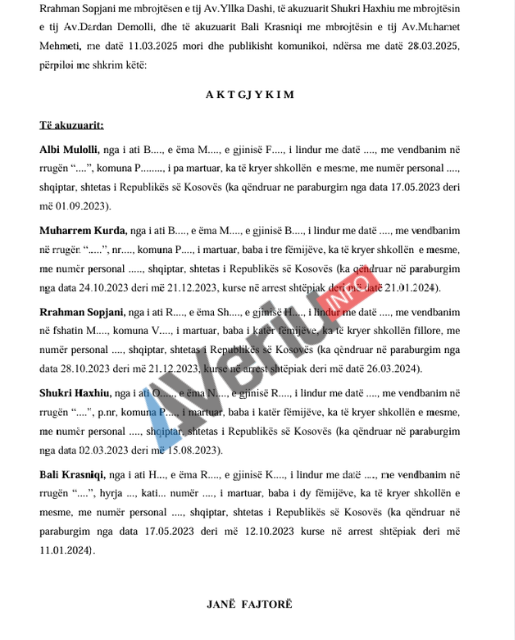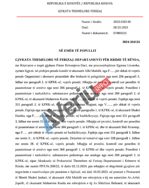Veriu.info ka siguruar aktgjykimin e shpallur nga Gjykata Themelore në Ferizaj ndaj Albi Mulolli, Muharrem Kurda, Rrahman Sopjani, Shukri Haxhiu e Bali Krasniqi, të cilëve dënimi i shqiptuar iu ka kthyer në vlerë monetare (gjobë), përveç Bali Krasniqit, përkundër që janë shpallur fajtorë për fajde, detyrim, organizim të skemave piramidale dhe bixhozit, armëmbajtje pa leje dhe posedim të narkotikëve.