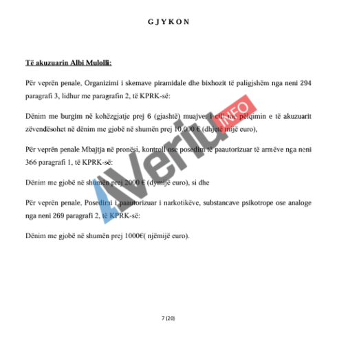 Me aktgjykimin e Gjykatës së Ferizajt, Albi Mulolli është gjetur fajtor për këto vepra penale: Organizimi i skemave piramidale dhe bixhozit të paligjshëm; Mbajtja në pronësi, kontroll ose posedim të paautorizuar të armëve dhe Posedimi i paautorizuar i narkotikëve, substancave psikotrope ose analoge.