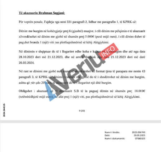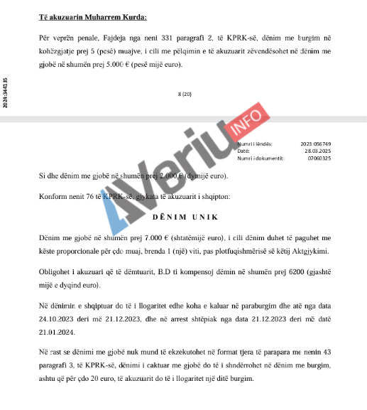 Të njëjtit, gjykata i ka shqiptuar dënim unik me gjobë prej 7 000 (shtatë mijë) euro, duke e obliguar t’i kompensojë të dëmtuarit shumën prej 6 200 euro.