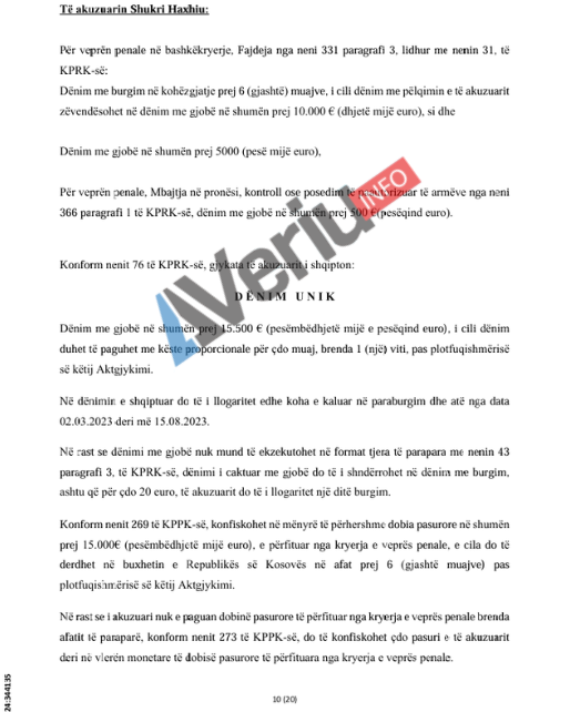 Gjykata e Ferizajt i ka shqiptuar dënim unik prej 15 mijë e 500 euro, i cili mund të paguhet me këste brenda një viti nga plotfuqishmëria e aktgjykimit.