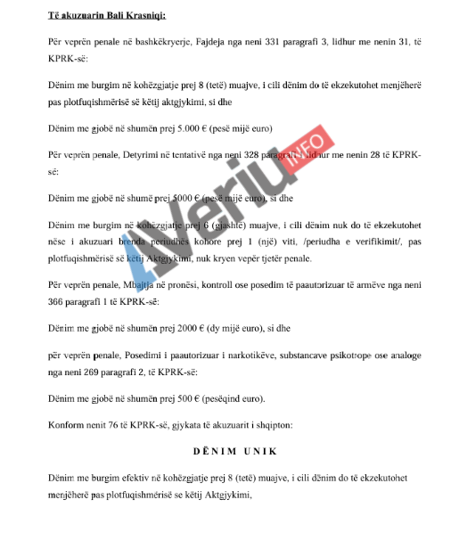 Për armëmbajtje pa leje është dënuar me 2 mijë euro, ndërsa për posedim të narkotikëve është dënuar me gjobë prej 500 euro. Për të akuzuarin Bali Krasniqi, gjykata ka shpallur dënim unik prej 8 (tetë) muajsh burgim efektiv, dënim me gjobë prej 12 mijë e 500 euro dhe dënim me burgim prej 6 muajve, por ky i fundit nuk do të ekzekutohet nëse ai nuk kryen vepër tjetër penale brenda 1 viti.