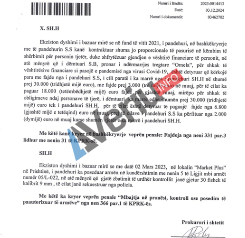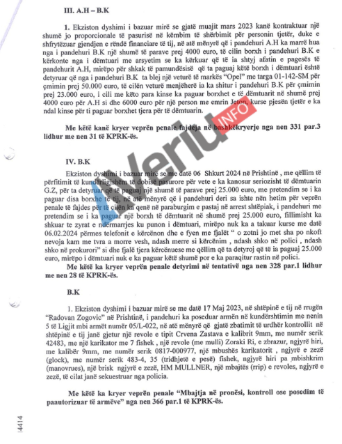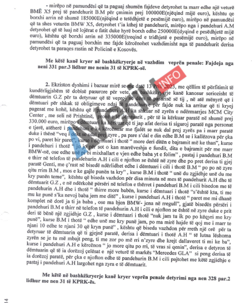Arlind Hasani e Bali Krasniqi, sipas aktakuzës së prokurorisë, akuzoheshin se në mars 2023 e kanë detyruar të dëmtuarin G.Z. që të blejë një veturë nga Bali Krasniqi në vlerë prej 50 mijë euro, të cilën menjëherë i dëmtuari ia ka shitur Bali Krasniqit për 23 mijë euro, ku me këto para kinse është paguar borxhi prej 4 mijë euro ndaj Arlind Hasanit dhe borxhi prej 6 mijë euro ndaj personit me emrin Jeton, përderisa shuma tjetër prej 13 mijë euro është ndalur nga Bali Krasniqi për t’i paguar kinse disa borxhe të tjera për të dëmtuarin G.Z.