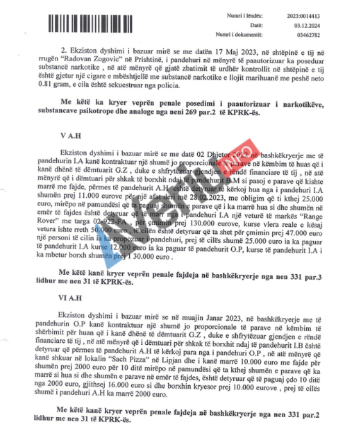 Sipas prokurorit Rasim Maloku, Arlind Hasani në janar 2023 i ka ndërmjetësuar të dëmtuarit G.Z. që të marrë para me fajde nga O.P. në vlerë prej 10 mijë euro për t’ia kthyer pas 10 ditësh 2 mijë euro më shumë në emër të fajdes, ku në pamundësi për ta paguar borxhin është detyruar çdo 10 ditë të paguajë nga 2 mijë euro në shumë totale prej 16 mijë euro, si dhe borxhin kryesor prej 10 mijë euro. Pra, për 10 mijë euro të marra me fajde, ka paguar gjithsej 26 mijë euro, duke u dëmtuar për 16 mijë euro.
