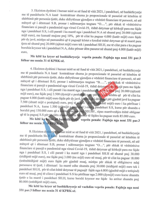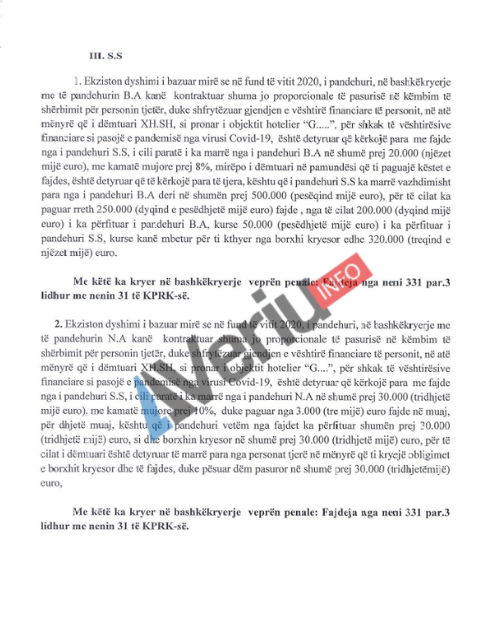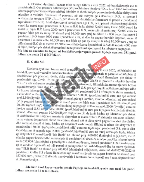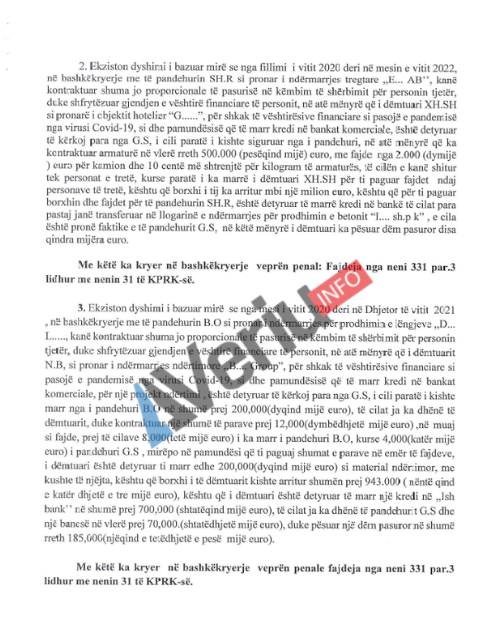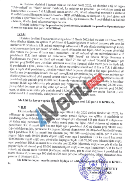 Aktuakuza e prokurorit Rasim Maloku, tregon që i dëmtuari N.B. është detyruar të marrë kredi bankare në vlerë prej 700 mijë euro, të cilat ia ka dhënë Gëzim Sinani dhe një banesë në vlerë 70 mijë euro, duke pësuar dëm pasuror prej 185 mijë euro.