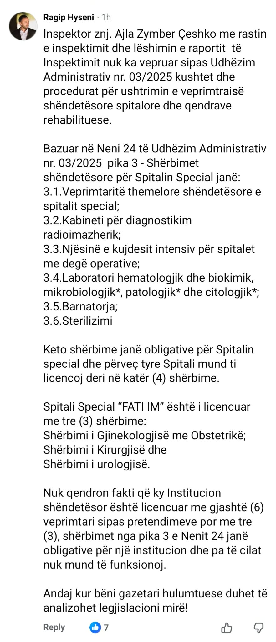 Sipas Hysenit, inspektorja e rastit ka gabuar me rastin e inspektimit dhe lëshimit të raportit të inspektimit, edhe pse në vendimin e tij shkruan se spitali “Fati Im” është licencuar në 6 veprimtari.