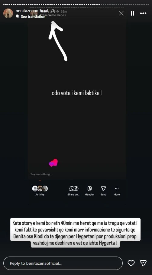 Fillimisht, pak para se të shpalleshin finalistët, në InstaStory u publikua një mesazh ku shkruhej: “Çdo votë e kemi faktike”, duke lënë të kuptohej se ata kishin bindjen se mbështetja e publikut ishte në anën e Benitës.