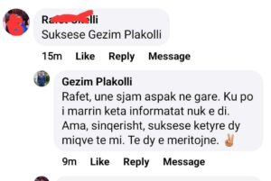 “Une sjam aspak ne gare. Ku po i marrin keta informatat nuk e di. Ama, sinqerisht, suksese ketyre dy miqve te mi. Te dy e meritojne. ✌🏼”, ka shkruar në replikë Plakolli.