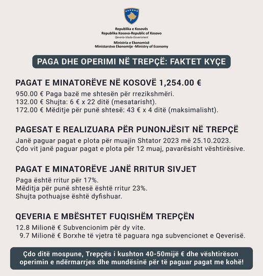 Sa i përket pagave për muajin shtator, Qeveria ka ndarë 1.64 milionë euro për Trepçën një ditë para se të fillonte greva, pra më 23 tetor 2023, ndërsa ndërmarrja ka ekzekutuar pjesën e mbetur të pagave më 25 tetor (një ditë pas fillimit të grevës).