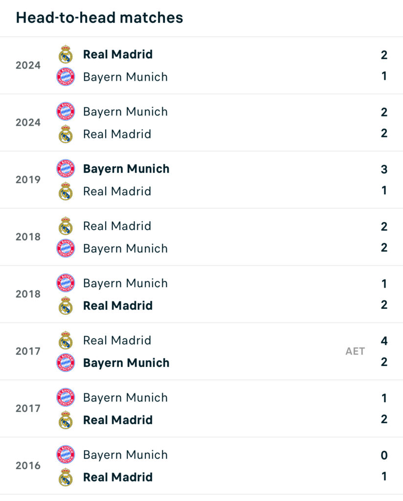 Përballja e fundit mes dy skuadrave ishte në vitin 2024, ku Real Madrid eliminoi Bayern Munich në gjysmëfinale, e pastaj u shpall fitues i Champions League, pasi në finale e mposhti Borusia Dortmundin.