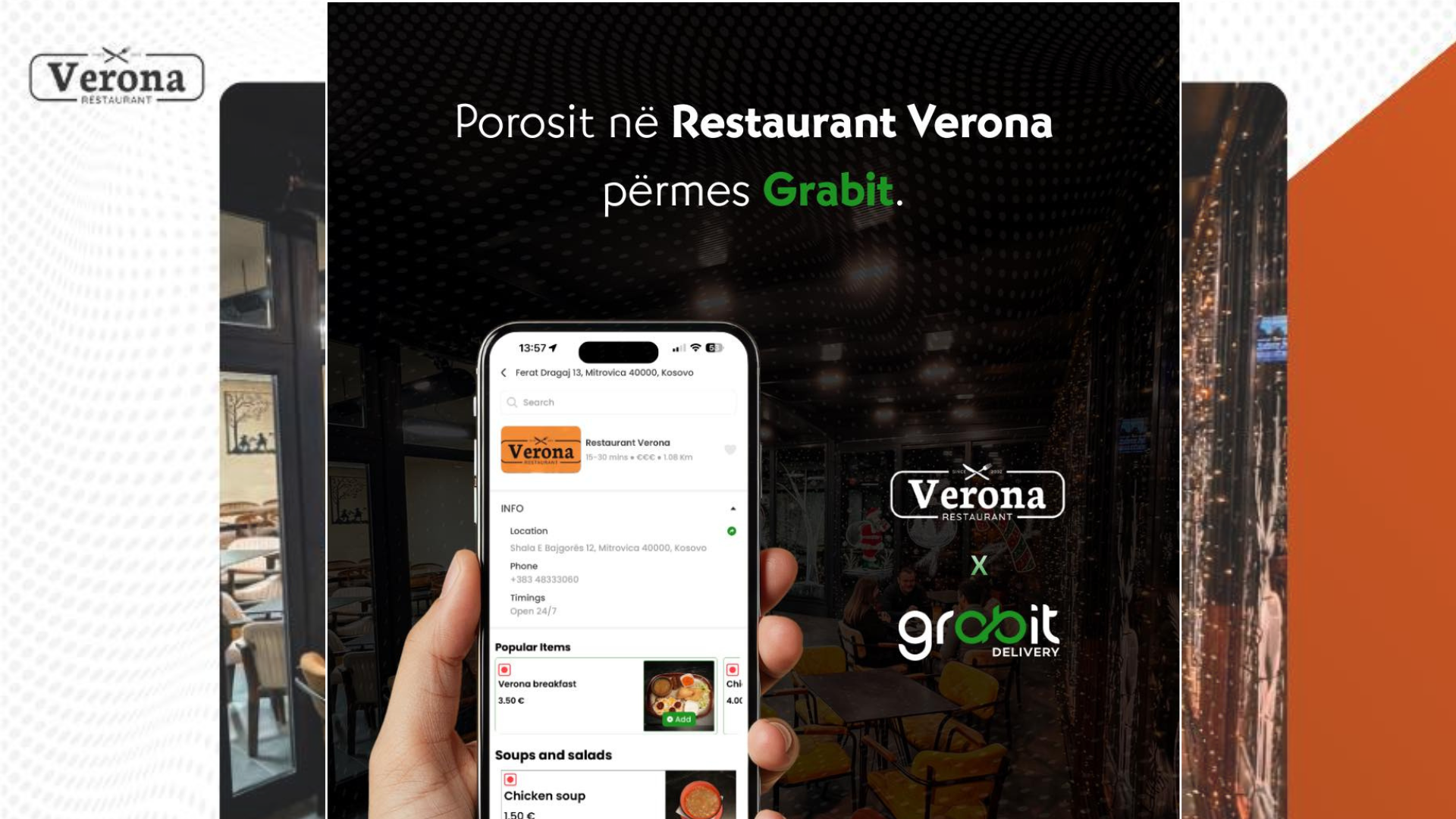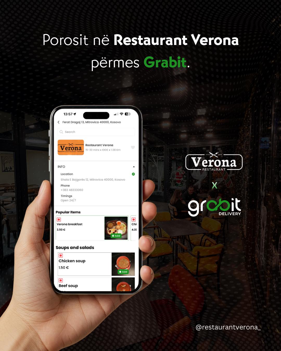Për të përfituar nga kjo mundësi e re e Restorantit Verona, klientët duhet të shkarkojnë aplikacionin “Grabit” në telefonin e tyre mobil. Përmes aplikacionit, porositja bëhet lehtë dhe shpejt, duke zgjedhur ushqimin e preferuar nga menuja e Veronës, ndërsa Grabit kujdeset për shpërndarjen deri në shtëpinë tuaj. (Linku: https://apps.apple.com/us/app/grabit-express-a-to-b/id6751872182)