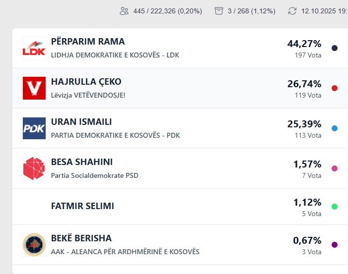 Nga rezultatet e para 1.12%, në Prishtinë prin Përparim Rama me 44,.27%, i pasuar nga Hajrulla Çeko me 26.74%, raporton Gazeta Online Veriu.info.
