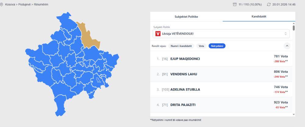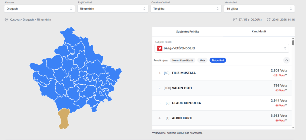Një situatë e ngjashme me kandidatët e VV’së është edhe në Dragash. Për dallim nga partitë e tjera, atje ku tashmë ka përfunduar rinumërimi i plotë, një kandidati të VV’së, u janë hequr qindra vota. Më saktësisht, Filiz Mustafa tash ka 231 vota më pak. /GazetaExpress