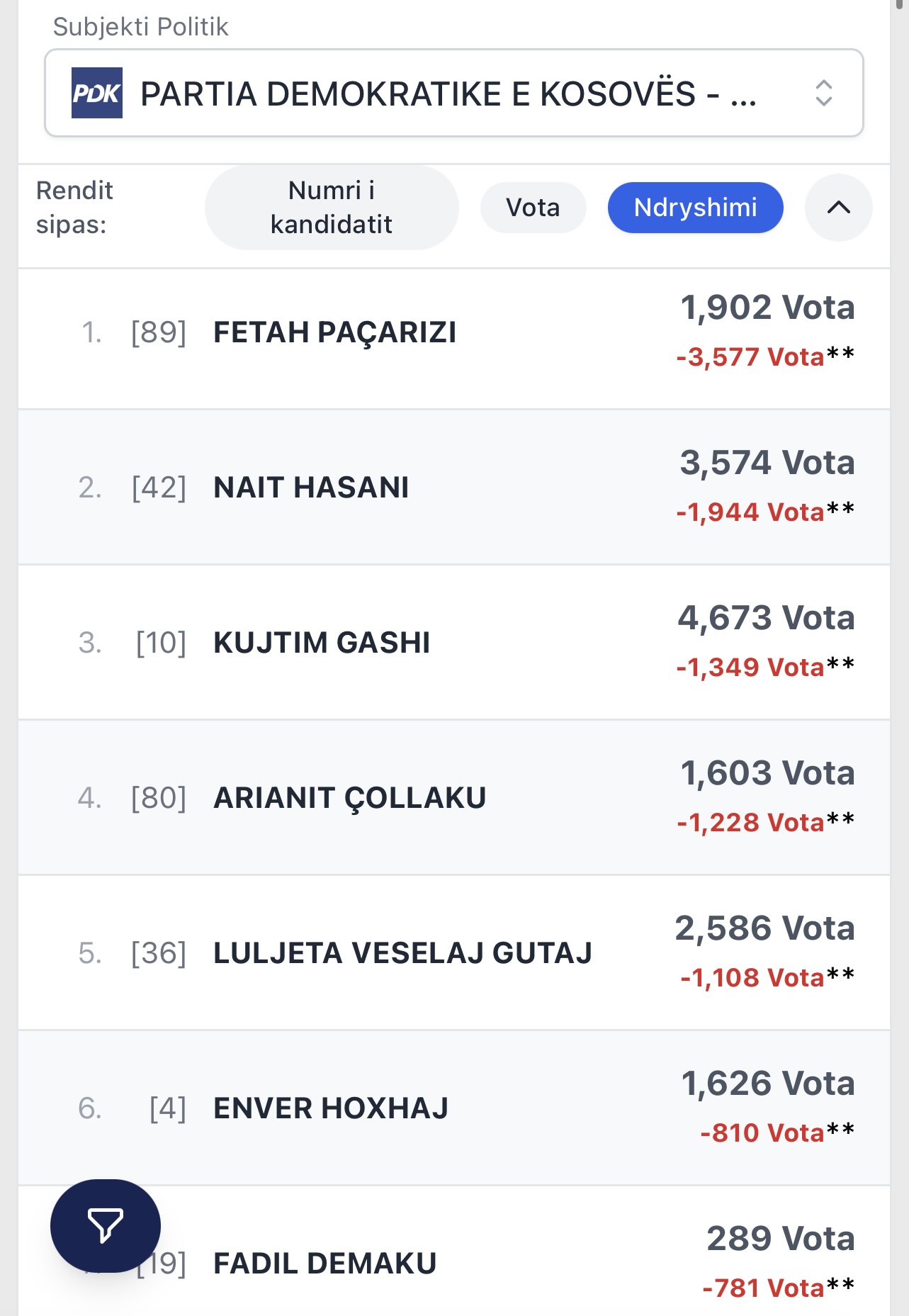 Kandidati i PDK-së që i prin kësaj liste është Fetah Paçarizi të cilit në rinumërim ka marrë vetëm në Prizren 3577 vota më pak, kur nuk janë rinumëruar as gjysma e kutive.