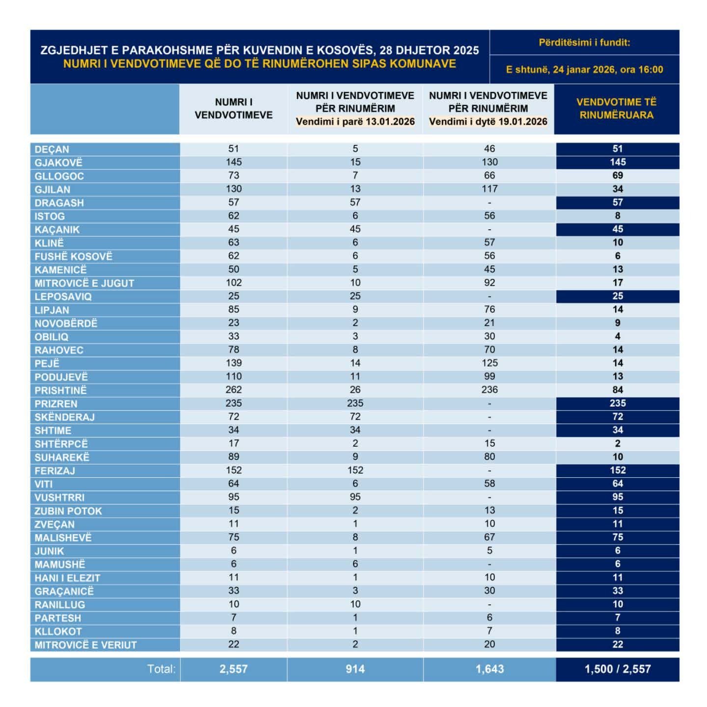“Nga fillimi i këtij procesi (e martë, 13 janar 2026, ora 18:00) dhe deri më tani (e shtunë, 24 janar 2026, ora 16:00) janë rinumëruar mbi 58% apo 1,500 nga 2,557 vendvotime”, ka njoftuar zëdhënësi i KQZ-së, Valmir Elezi.
