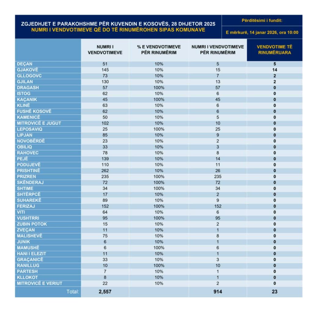 Nga nisja e këtij procesi dhe deri më tani (e mërkurë, 14 janar 2026, ora 10:00) janë rinumëruar 23 vendvotime nga 914 për të cilat KQZ ka marrë vendim që të rinumërohen.