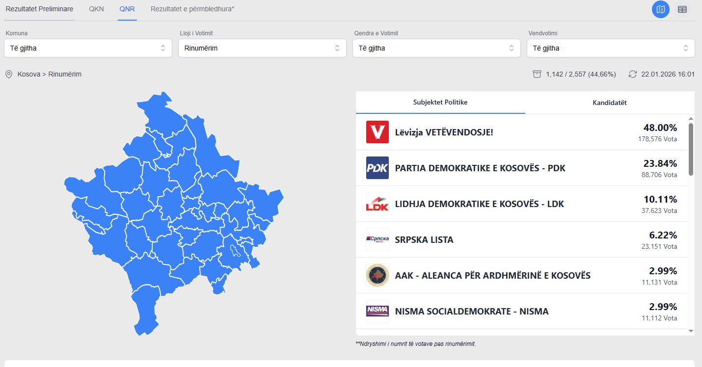 Bazuar në përditësimin e fundit të Komisionit Qendror të Zgjedhjeve, deri më tani janë rinumëruar 44.66%.
