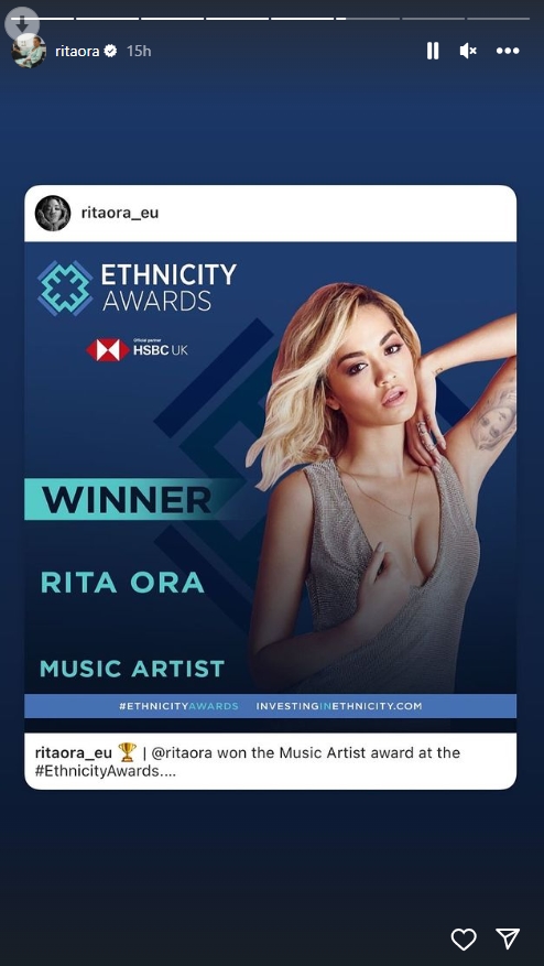 E emocionuar për këtë arritje, Ora ndau njoftimin me ndjekësit e saj në rrjetin social Instagram. Ky është çmimi i saj i dytë që ajo fiton gjatë këtij viti.