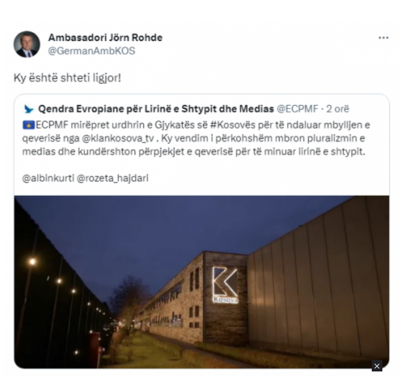 Ambasadori Jorn Rohne ka reaguar pas vendimit të Gjykatës Komerciale në rastin e Klan Kosovës