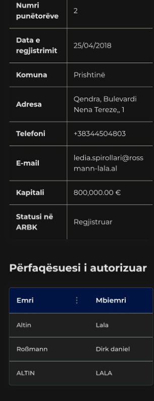 “Rossmann & LALA SH.P.K” figuron si biznes i regjistruar në Kosovë me pronarë: Altin Lala dhe Roßmann Dirk daniel.