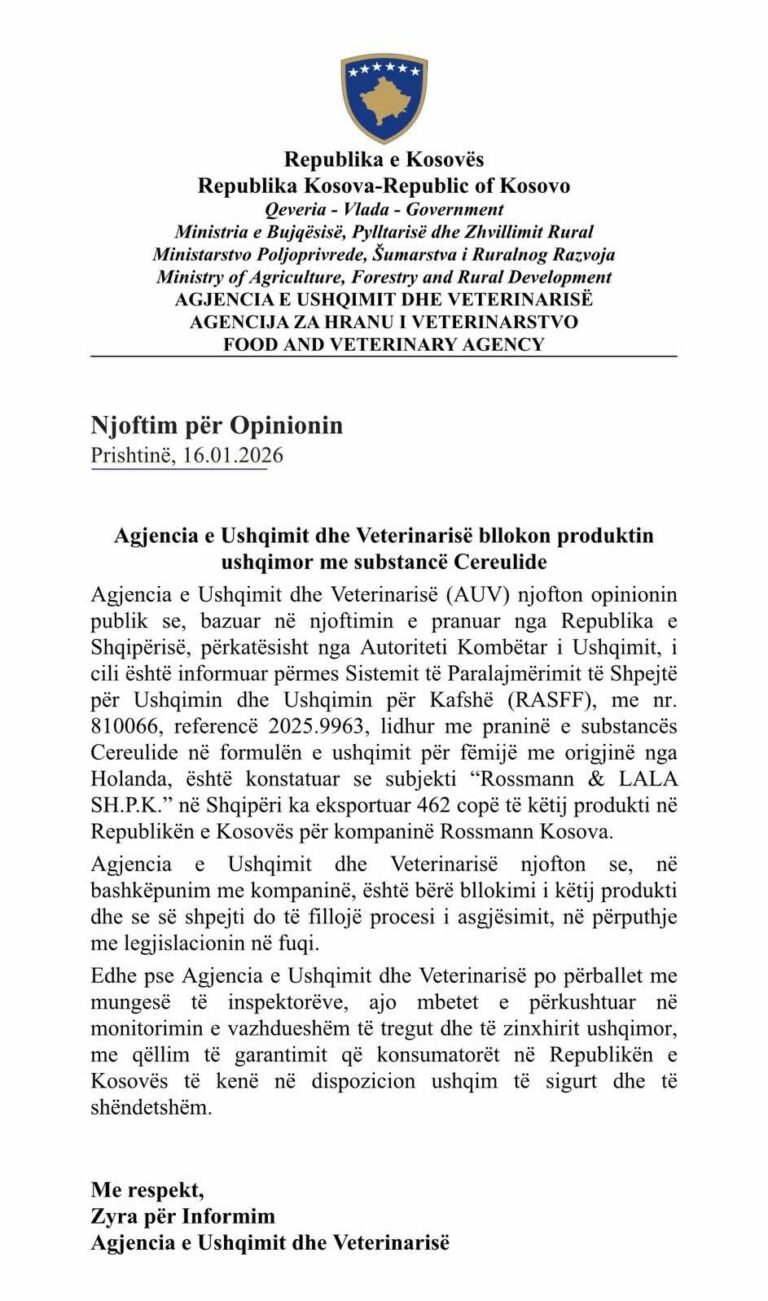 Agjencia e Ushqimit dhe Veterinarisë (AUV) ka bllokuar një produkt ushqimor për fëmijë në Republikën e Kosovës, pasi është konstatuar prania e substancës Cereulide, e cila paraqet rrezik për shëndetin.