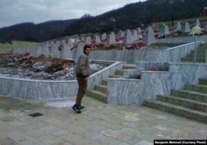 Benjamin Mehmeti në varrezat e Reçakut, ku janë varrosur motra e madhe dhe babai i tij – të vrarë gjatë Masakrës së Reçakut.