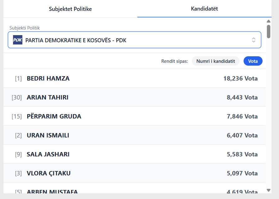 Ndërsa, numërimi i votave të kandidatëve për deputetë ka shkuar në 12,83%, rezultatet preliminare për kandidatët më të votuar të Partisë Demokratikë të Kosovës është si në vijim: