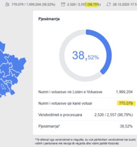 Në përditësimin e të dhënave nga KQZ (ka mbetur edhe 1.2% e votave të pranuara deri në ora 17:00 të procedohen”, janë regjistruar 770 mijë e 79 votave.