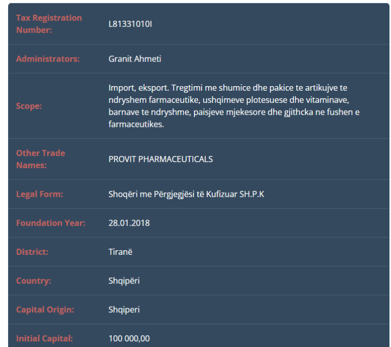 Në bazë të përshkrimit të aktivitetit biznesor, thuhet se kompania bën importin dhe eksportin e tregtimin me shumicë dhe pakicë të artikujve të ndryshëm farmaceutikë, si dhe pajisjeve mjekësore.