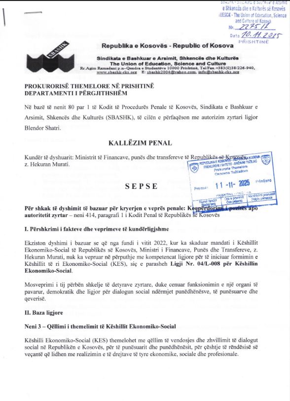 SBASHK ka dorëzuar kallëzim penal në Prokurorinë Themelore në Prishtinë te Departamenti i përgjithshëm, ndaj ministrit në detyrë Hekuran Murati.Kjo sindikatë thekson se kallëzimi është bërë “për shkak të dyshimit të bazuar të keqpërdorimit të detyrës zyrtare, duke mos vepruar sipas Ligjit për Këshillin Ekonomik Social, duke mos shpallur që nga fundi i vitit 2022 ftesën për formimin e këtij Këshilli për çka është i obliguar ligjërisht”.“Me këtë mosveprim, Murati ka shkaktuar dëme të palës së tretë, pra sindikatave dhe anëtarëve të sindikatave në tërë Kosovën duke pamundësuar diskutimin për Ligjet dhe rregulloret që prekin gjithë të punësuarit në Kosovë e me theks të veçantë duke e lënë Kosovën pa Marrëveshjen Kolektive si e drejtë që buron nga Ligji i punës dhe kështu Kosova mbetet si i vetmi shtet në rajon që nuk ka këtë Marrëveshje të nënshkruar”, thuhet në njoftim për media të Sindikatës së Arsimit.